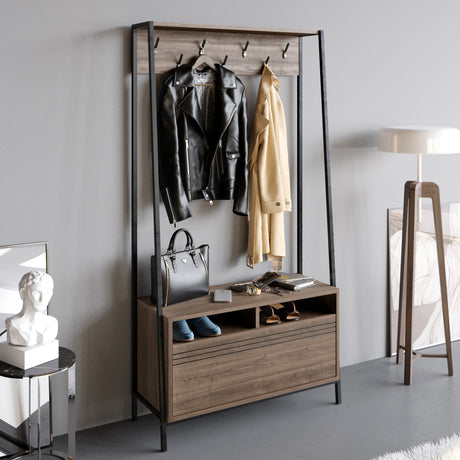 389,93Precio unitario /AgotadoMueble de guardarropa Perchero Nogal Melamina Devon - Con Compartimentos y Cajón