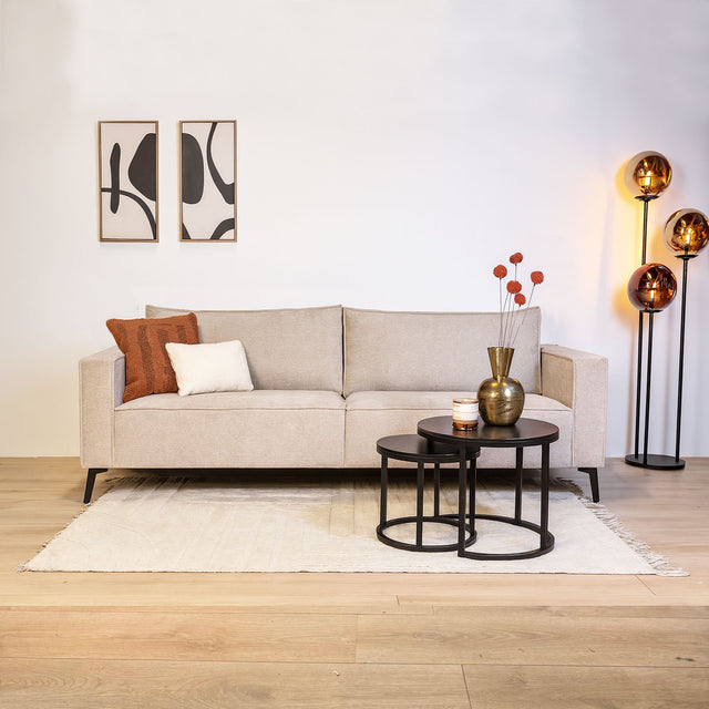 El Yara de 3 plazas está tapizado con una tela de chenilla suave y duradera en color antracita. La chenilla es conocida por su sensación cómoda y lujosa, pero sobre todo por su durabilidad. La tela le da al sofá una textura rica y suave y un acabado ligeramente brillante que agrega un toque de lujo a tu interior.