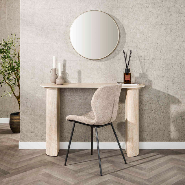 La mesa de tocador de travertino Archon combina una forma curva elegante con un acabado duradero de cerámica de travertino. Este mueble compacto es ideal como tocador o mesa de entrada en un vestíbulo o dormitorio moderno donde se desea un aspecto de piedra natural sin el peso y el mantenimiento de la piedra natural real. El diseño sencillo y el color neutro del travertino combinan bien tanto con estilos de interior tranquilos como contrastantes.
