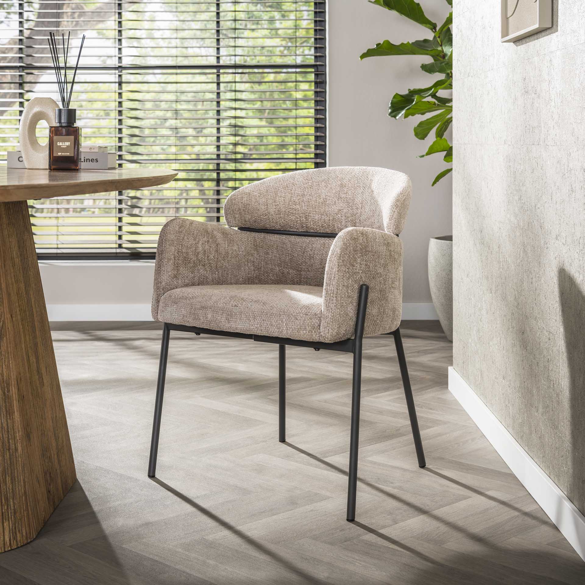 Silla de comedor Lola Bouclé de tela color arena con respaldo redondo y brazos
