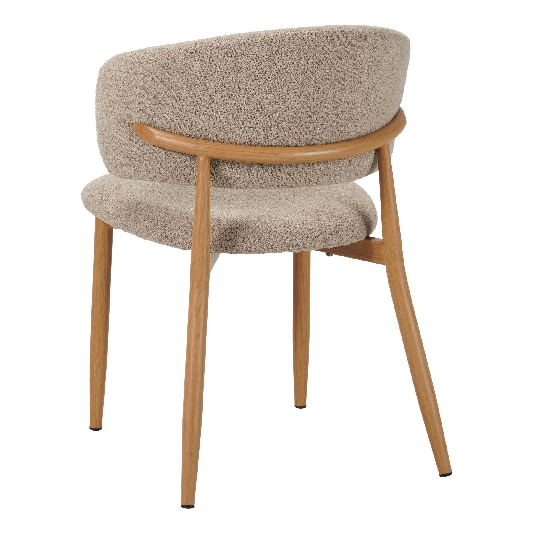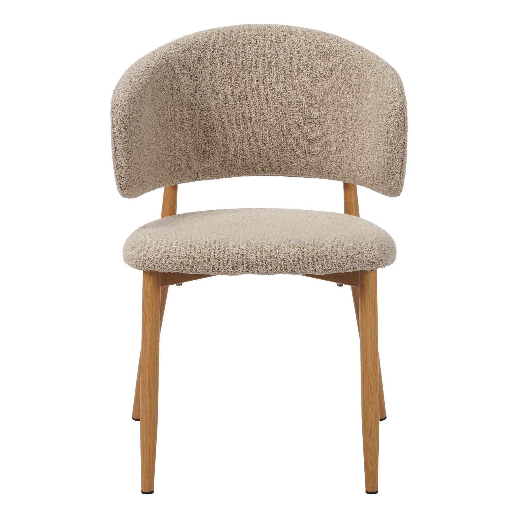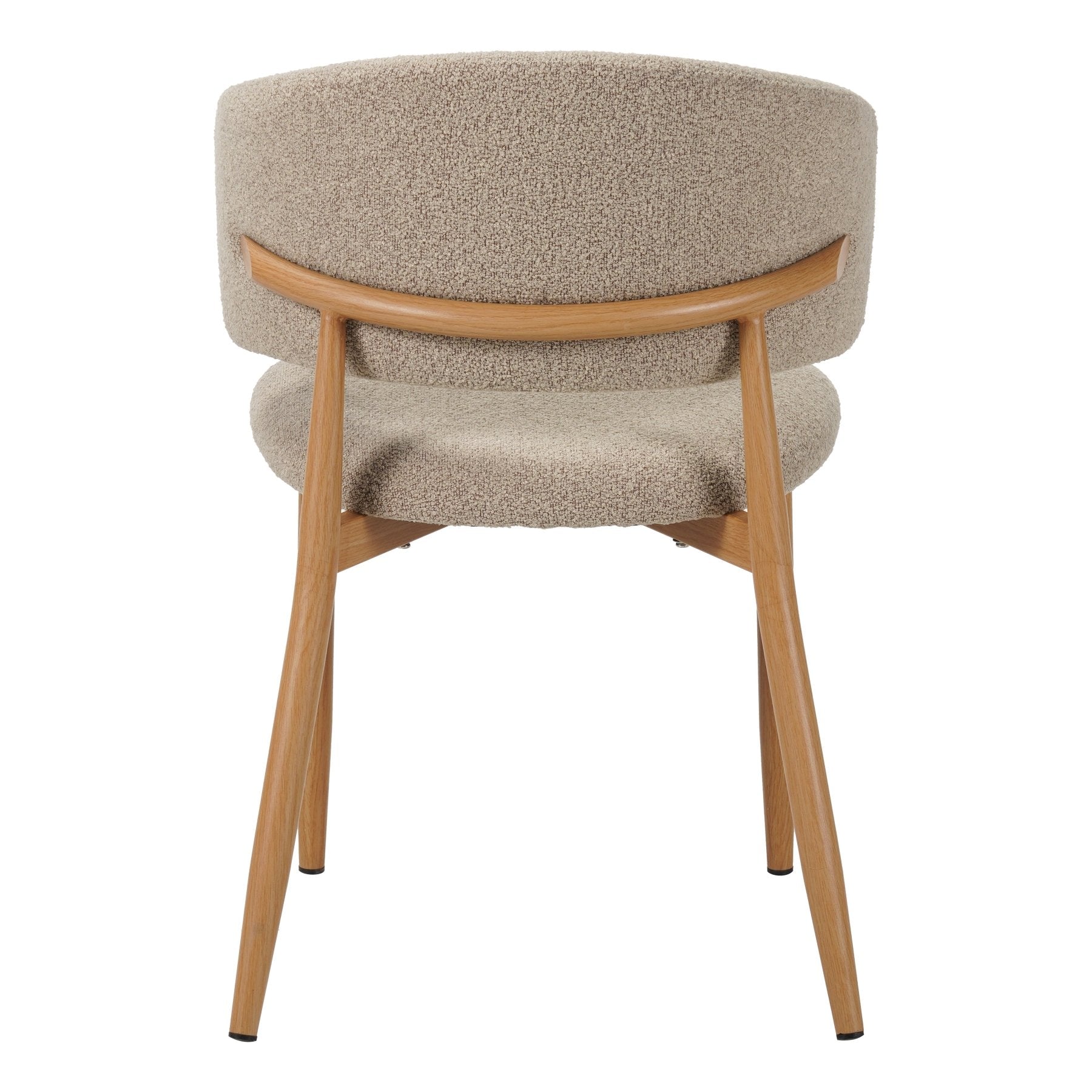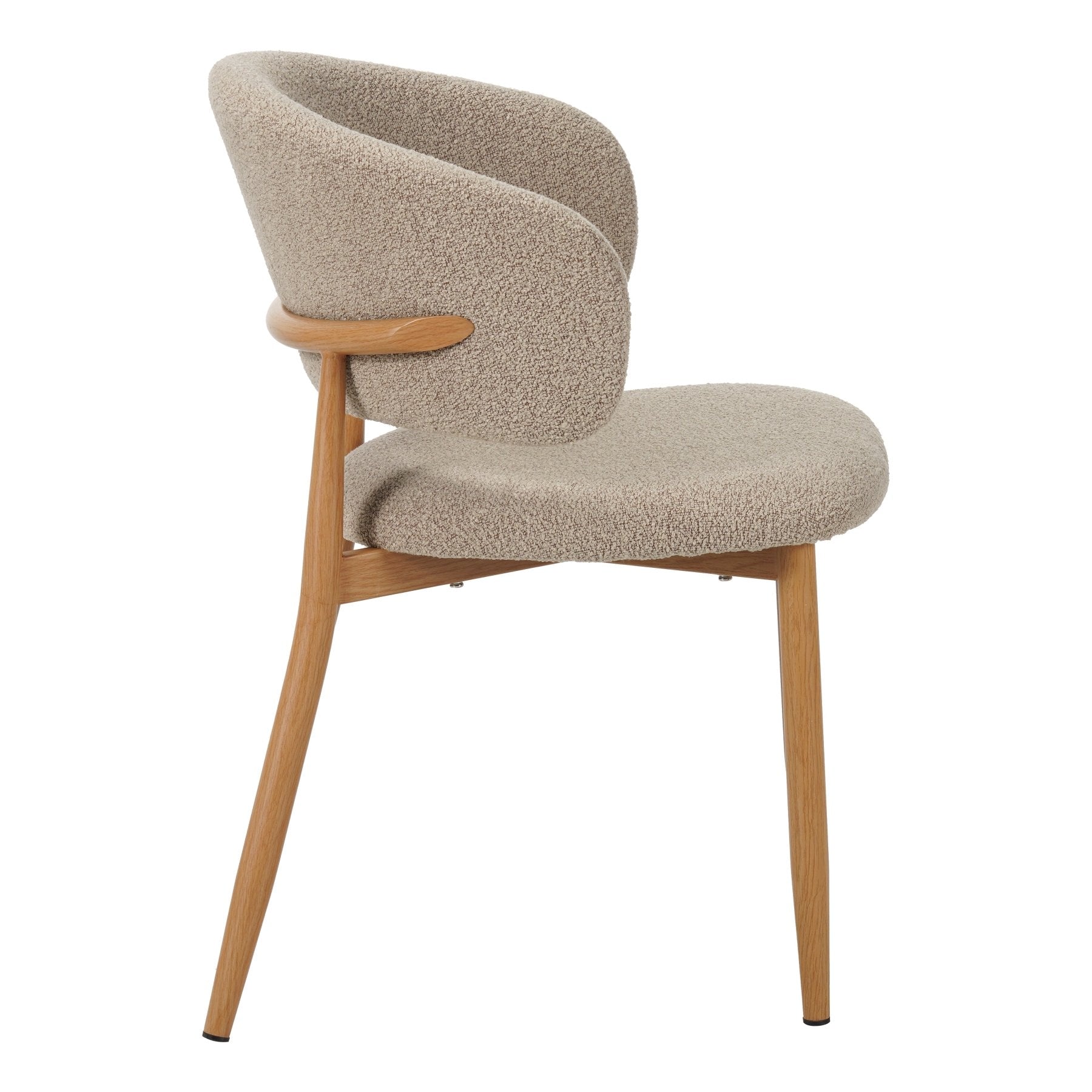De Yuka stoel biedt heerlijk zitcomfort dankzij de zachte bekleding en afgeronde rugleuning. De metalen poten met houtlook zijn stevig en onderhoudsvriendelijk. Let op: bouclé is een stof met een lusstructuur, waardoor voorzichtig gebruik aangeraden wordt bij huisdieren.