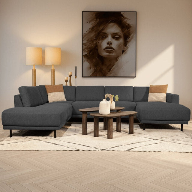 De Aniko U-vorm hoekbank is dé keuze voor wie ruimte wil combineren met stijl. Met royale afmetingen en een comfortabele lounge-indeling is deze bank ideaal voor gezinnen of voor wie graag gasten ontvangt. De strakke lijnen en antraciet stof maken dit een tijdloze blikvanger in je interieur.