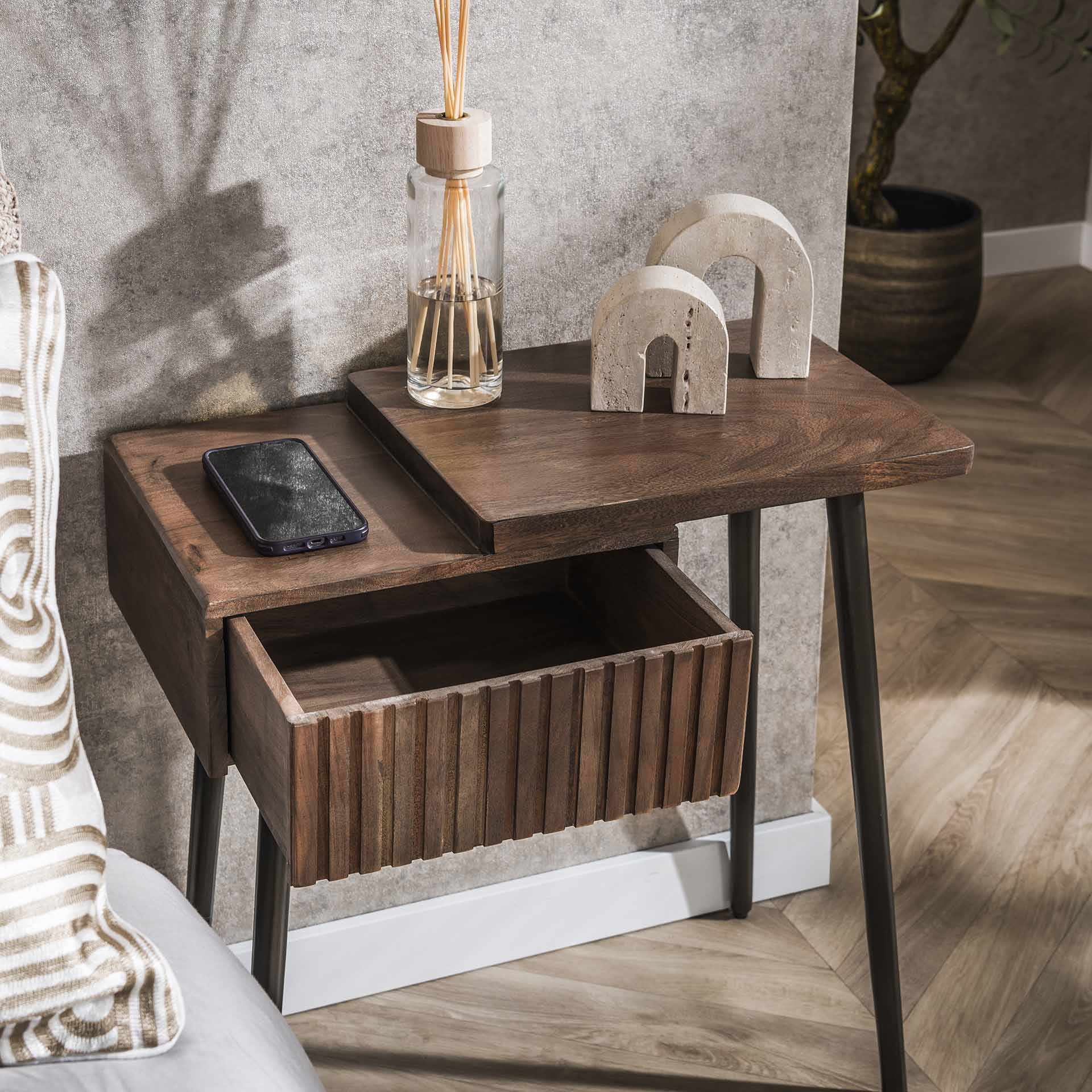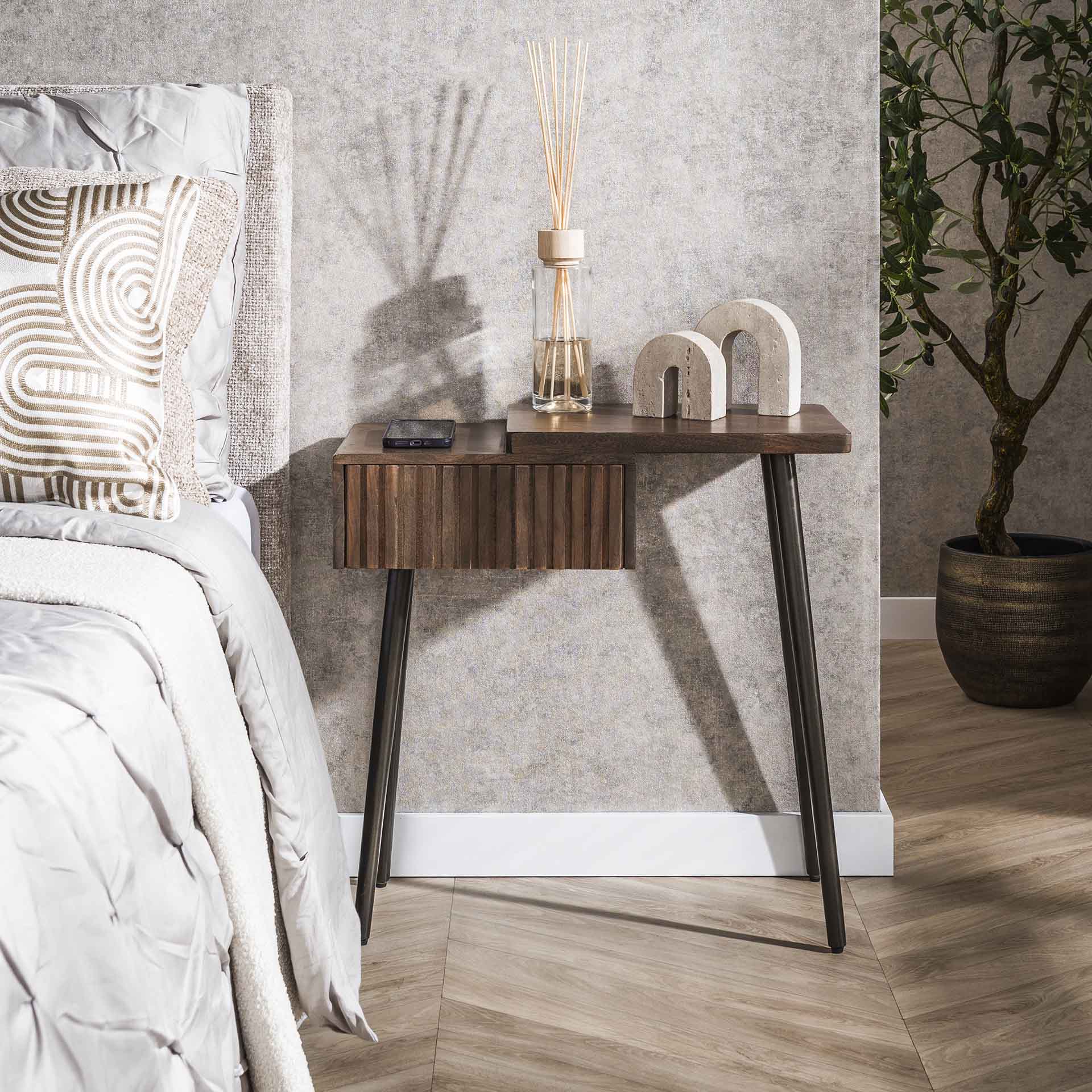 Haz que tu dormitorio esté completo con la mesita de noche Oslo. Esta elegante mesita de noche está fabricada en madera maciza de acacia y acabada en un cálido tono marrón drift. La versión derecha asegura una colocación lógica junto a tu cama, mientras que el cajón ofrece suficiente espacio para tus esenciales. Gracias a la veta natural de la madera y a los sutiles matices de color, Oslo aporta ambiente directamente a cualquier dormitorio, desde moderno hasta industrial. Su tamaño compacto lo hace ideal tanto para habitaciones espaciosas como para habitaciones más pequeñas.