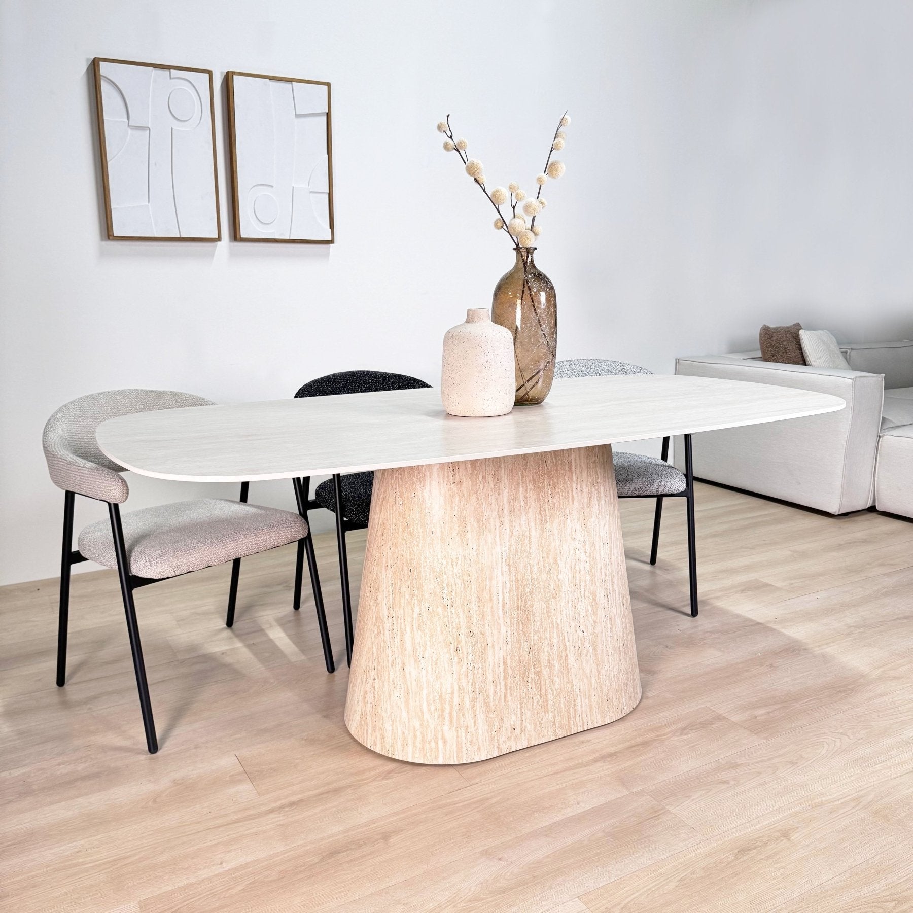 Dado que el bouclé generalmente viene en tonos tranquilos y neutros, se adapta perfectamente a diversos estilos de interior y combina sin esfuerzo con formas limpias u orgánicas. El material es de naturaleza duradera y mantiene su hermosa apariencia incluso después de un uso prolongado, lo que hace que las largas cenas nunca se sientan incómodas. ¿Quieres tranquilidad y, al mismo tiempo, carácter en tu interior? Con bouclé eliges elegancia atemporal y comodidad en uno.