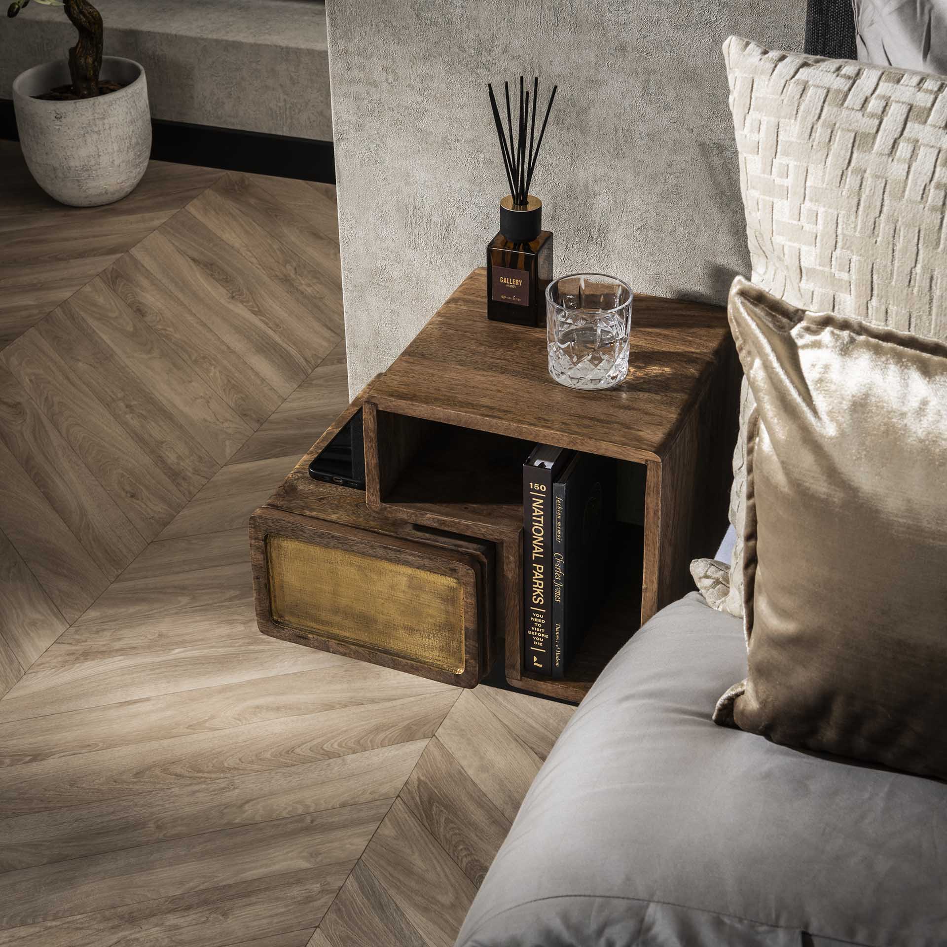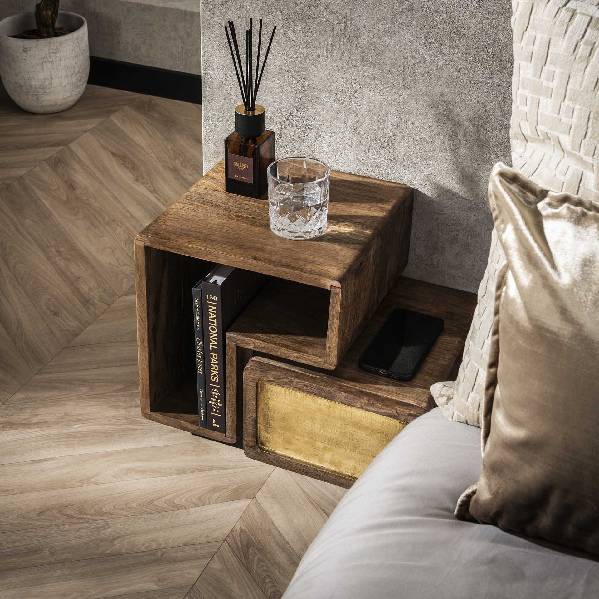Este conjunto de 2 mesitas de noche de la colección Solano combina cálida madera maciza Madera de mango con elegantes detalles en latón. Diseñado para un aspecto natural y atemporal que combina fácilmente con diversos estilos de dormitorios. Sus dimensiones compactas los hacen adecuados tanto para habitaciones más pequeñas como más grandes. Cada mesita ofrece una superficie sólida para una lámpara, un libro o un vaso de agua y tiene un acabado cuidado que resalta las vetas de la madera.
