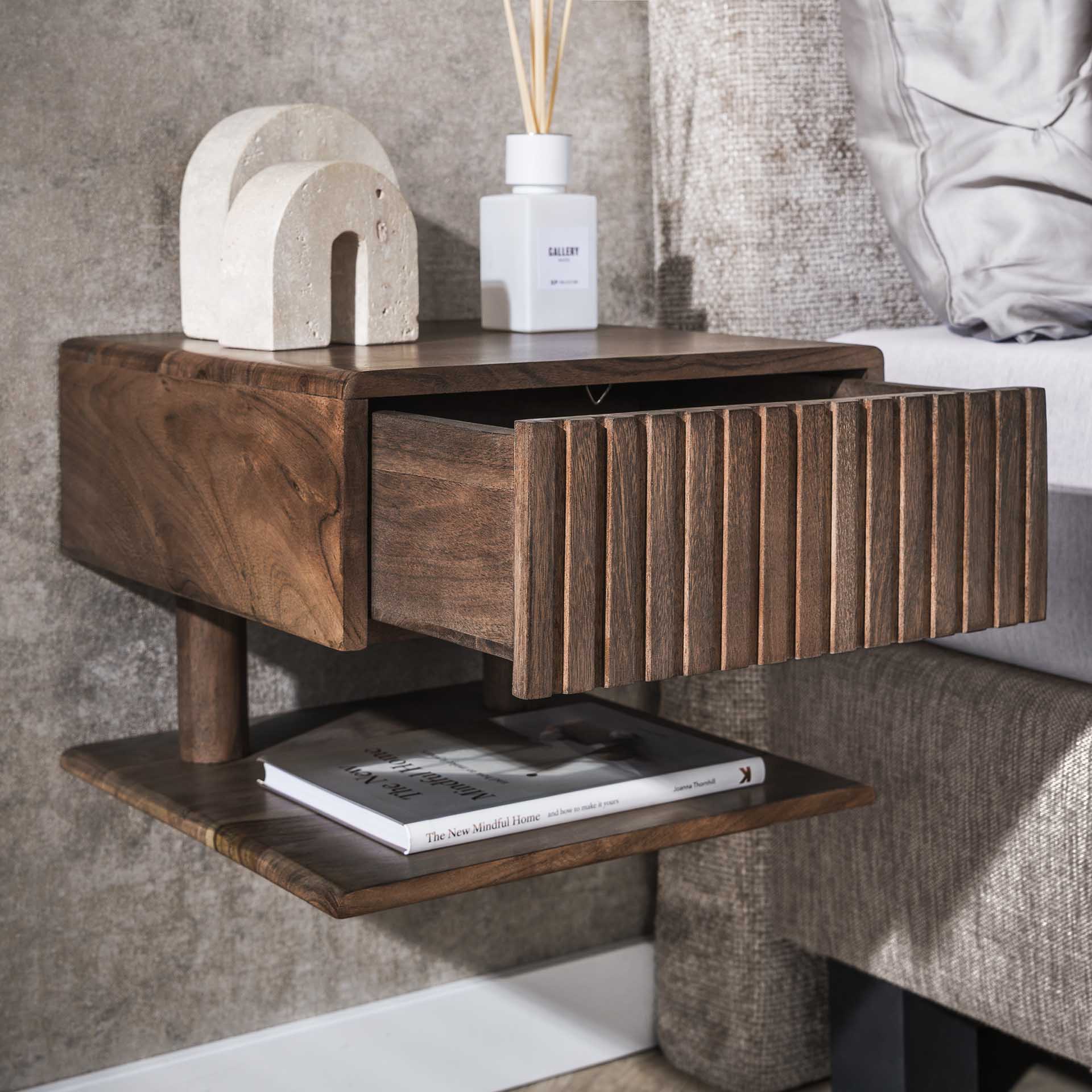 Descripción y especificaciones de Mesita de noche flotante Acacia Drift Brown – 1 cajón 35 cm